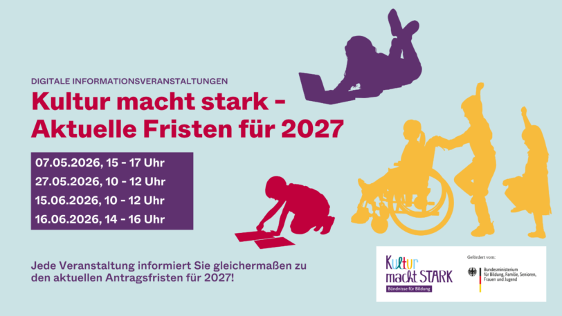 Die Beratungs- und Servicestellen aller Bundesländer des Förderprogramms Kultur macht stark. Bündnisse für Bildung bieten mit der Veranstaltungsreihe Kultur macht stark – Aktuelle Fristen für 2027 einen kompakten Überblick zu allen anstehenden Antragsfristen im Herbst 2026.