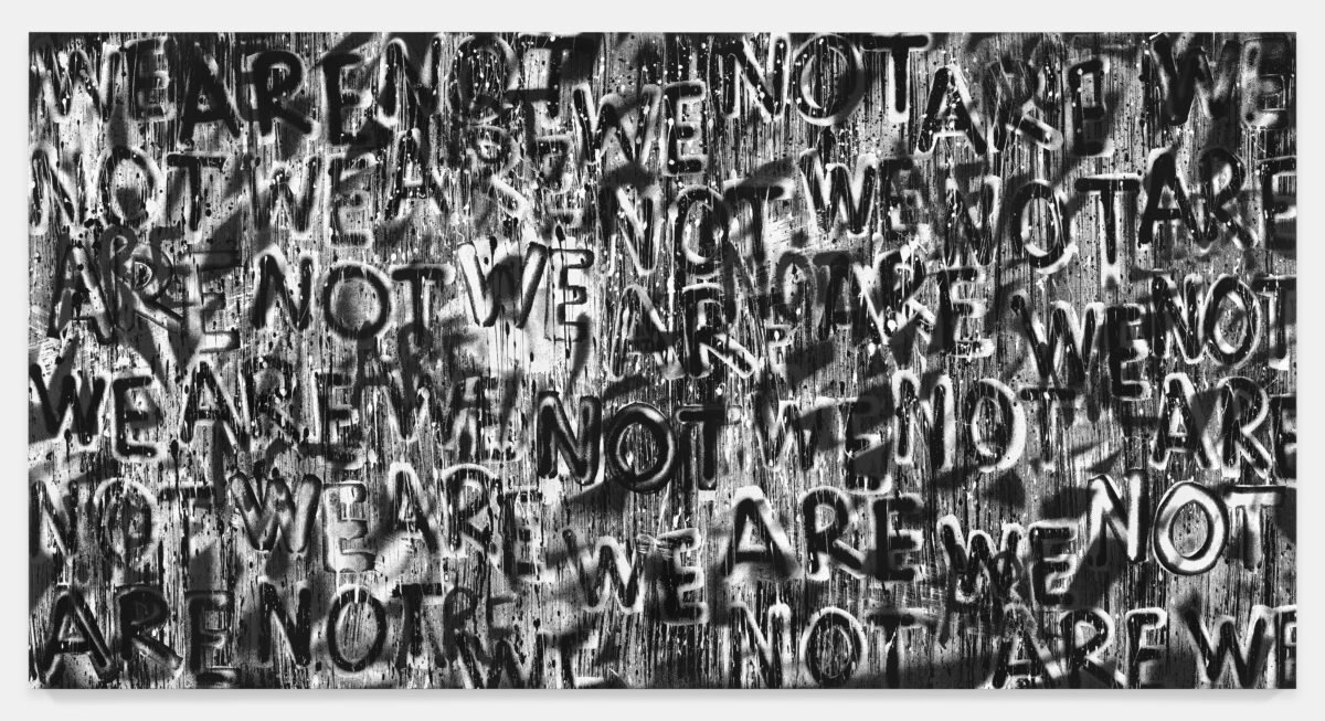 Abbildungsnachweis: Adam Pendleton, Ohne Titel (WE ARE NOT), 2021–2022, Siebdruck, Öl, Tinte auf Leinwand, 304,8 × 594,4 cm. Written Art Collection Foto: Andy Romer © Adam Pendleton