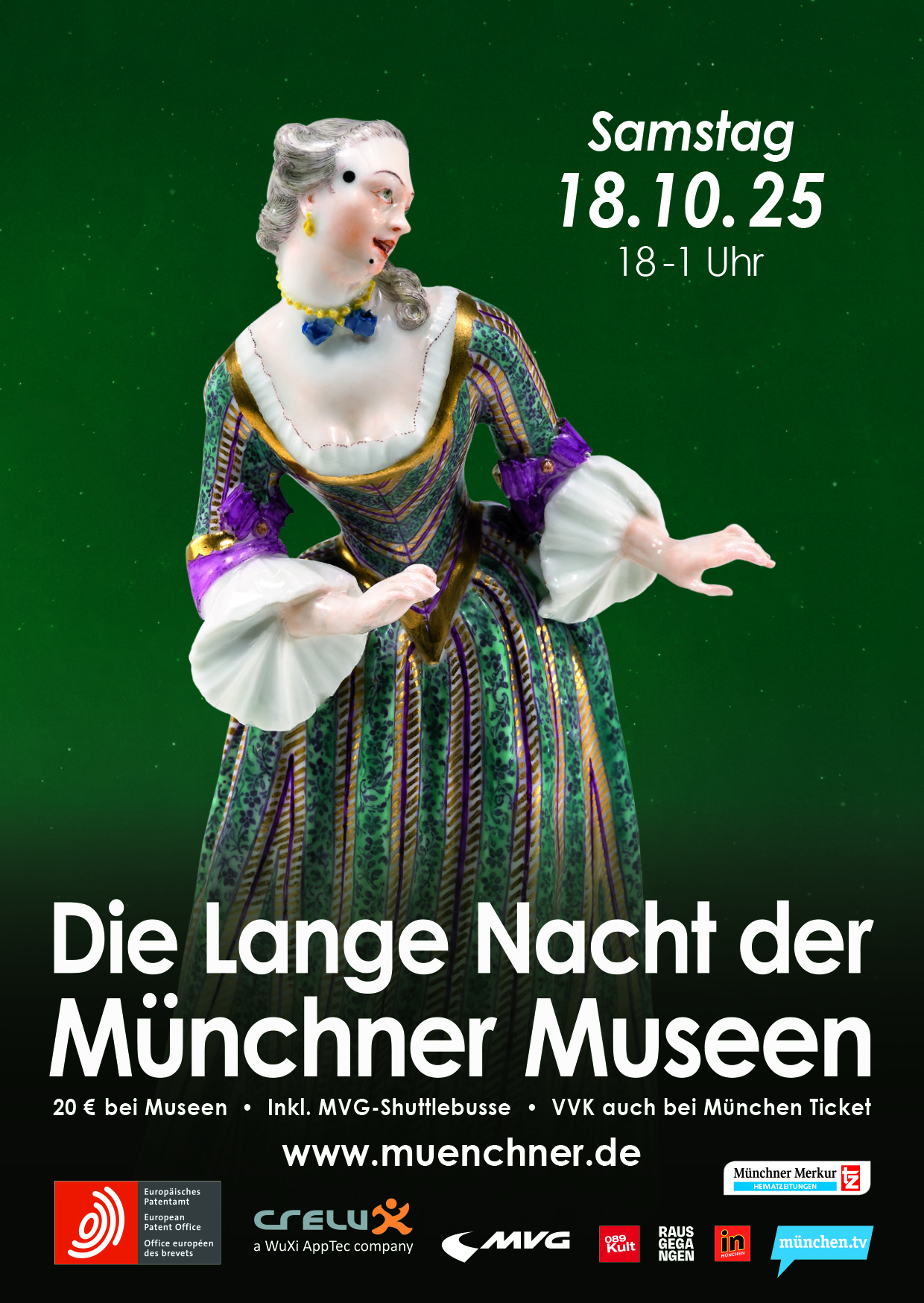 Abbildungsnachweis: Plakat zur Langen Nacht der Münchner Museen. Copyright des Originalmotivs: Isabella aus der Commedia dell’arte von Franz Anton Bustelli, um 1760, Bayerisches Nationalmuseum