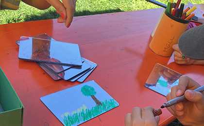 Im Pavillon des Museum to Go konnten Groß und Klein anschließend aktiv werden und an Magnetwänden eine eigene Ausstellung gestalten: aus rund 30 Objekten Münchner Museen auswählen, recherchieren, kommentieren, miteinander diskutieren, einigen, präsentieren und sich von Impulskarten inspirieren lassen! Selbst gedruckte Postkarten wurden in die Ausstellung integriert oder zum Verschenken und Versenden mitgenommen. Viel Raum verblieb wieder einmal für produktiven Austausch und Netzwerken. Erneut ein strahlend sonniger, friedlicher und kreativer Nachmittag!