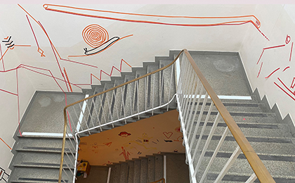 So entstand im Treppenhaus, das sonst ein praktischer Übergangsraum, Liminal Space, ist, ein Aufenthaltsort zum Kreativsein und zum Austausch. Neben dem Tape regten nämlich auch Fragen wie „Wer darf mitgestalten, wer nicht?“, „Wie wird ein Raum zu einem Kulturort?“ oder „Was macht Kunst zu Kunst?“ zu Gesprächen an. Teilnehmende, die sich nicht kannten, stellten sich diese Fragen oder berieten sich zu Motiven; ehemalige Arbeitskolleg*innen trafen sich zufällig wieder.