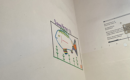 Nachdem ein Warmup anregte, sich nach der eigenen Stimmung zu fragen und ihr ein Kunstwerk zuzuordnen, experimentierten die Teilnehmenden mit Tape und Papier. Dann folgte ein Impuls, in dem über Safe/r Spaces und Brave/r Spaces als sichere, diversitätssensible Räume, über Kommunikation, das Zusammenleben, Unterschiede und Gemeinsamkeiten gesprochen wurde – und auch darüber, wie all das in ein gemeinsames Projekt einfließen kann. Gesagt, getan: in drei Teams erdachten sich die Schüler*innen ein Motiv, verteilten Rollen und entwickelten Methoden, einen Konsens zu finden. Nach einer Präsentation ging es ins Treppenhaus und die Ideen fanden ihren Weg vom Papier auf die Wand: eine Weltkugel und Flaggen symbolisierten Herkunft und Gemeinschaft, das „Wonderland“ zeigte eine Fantasiestadt, ein bunter Fisch stand für Vielfalt. Die Tapeart blieb an der Wand, sodass sie die stolzen Künstler*innen ihren Freund*innen und Familien zeigen konnten.